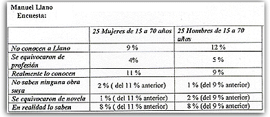 De cincuenta personas entrevistadas por la capital de Santander con edades comprendidas entre los 15 y los 70 ( 25 mujeres y 25 hombres), un 21 % de ellas no sabían quien era Manuel Llano, con el 29 % de las personas restantes hemos hecho la encuesta: