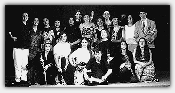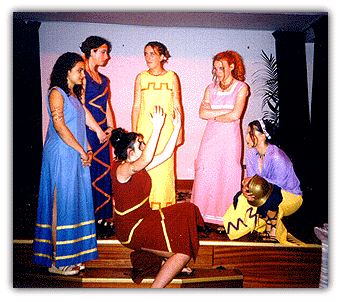 Hemos acudido a autores clásicos, otros más actuales e incluso a la creación colectiva de espectáculos. Además hemos querido utilizar técnicas teatrales diversas y combinadas entre sí (teatro negro, títeres, proyecciones...) El primer curso nos atrevimos con una adaptación de El sueño de una noche de verano de W. Shakespeare y una versión por cuatro actrices del monólogo de Eugene O´Neil Antes del desayuno. Al año siguiente pusimos en escena una creación colectiva en la que se jugaba con la utilización imaginaria de objetos ¿ sillas? Y nos enfrentamos a B. Bracht con Temores y miseria del III Reich. ![]() Aprovechando que Darío Fo recibió el preimo Nobel, estrenamos Aquí no paga nadie, realizamos un montaje Homenaje a Lorca y un espectáculo de teatro negro (1997/98). Lisístrata, la comedia de Aristófanes, ha sido representada este año y tenemos pendiente el estreno de una creación colectiva que cuestiona los mecanismos de nuestra vida contemporánea