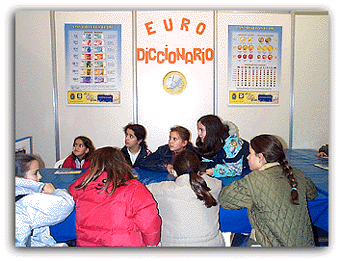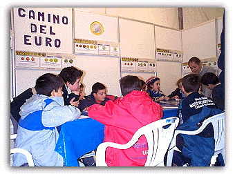Había 7 talleres, el primer taller que hicimos fue dibujar algo relacionado con el Euro, el segundo fue identificar los monumentos de Cantabria y relacionarlos con los billetes del Euro, en el tercero teníamos que definir términos relacionados con la U.M.E, el cuarto consistía en hacer un resumen aplicando el Euro en la vida diaria, y el quinto en realizar una compra en el menor tiempo posible.