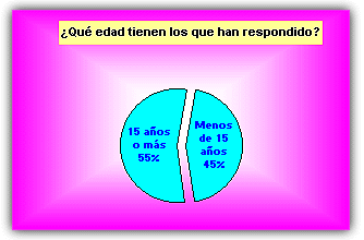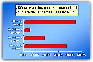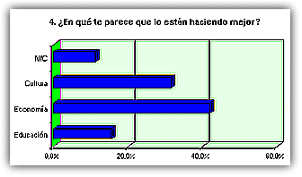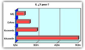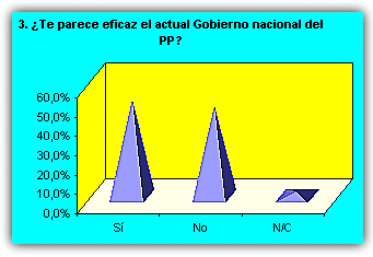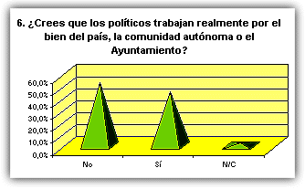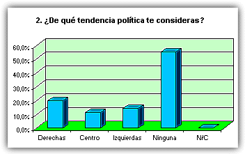 ![]() La mayoría de las respuestas corresponden a alumnos mayores de 15 años ![]() Ligera mayoría de féminas entrevistadas que de varones. ![]() Mayoría de alumnos de localidades de más de 10.000 habitantes, seguidos por los que viven en lugares de menos de 1.000. 1. ¿Te interesa la política? ![]() Representativo. A más de un 70% de encuestados no les interesa la política. 2. ¿De qué tendencia política te consideras? ![]() La apatía política se vuelve a manifestar de nuevo. Más de la mitad no se declara de ninguna corriente política. Entre las opciones, mayoría de derechas. 3. ¿Te parece eficaz el actual Gobierno nacional del PP? ![]() En este apartado, un 50% cree que el PP lo está haciendo bien, frente a un 46%, que opina lo contrario. 4. ¿En qué te parece que lo están haciendo mejor? ![]() 5. ¿Y peor? ![]() Casi el 60% dice que el país o la comunidad autónoma va peor en el terreno educativo. 6. ¿Crees que los políticos trabajan realmente por el bien del país, la comunidad autónoma o el Ayuntamiento? ![]() Un 52% opina que ser político es otro modo de ganarse la vida y hay que permanecer en el puesto para garantizarse el sueldo. 7. ¿Te gustaría trabajar en Política cuando seas mayor? ![]() Casi el 75% de los entrevistados no quiere saber nada de trabajar en política cuando sea mayor. 8. ¿Te parece que 'España va bien'? ![]() Para un 54% es cierto eso de que 'España va bien'.
