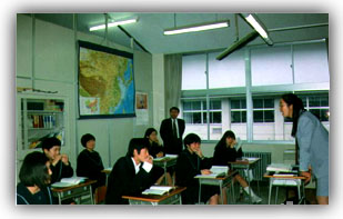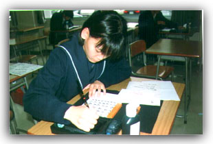 Alumna realizando prácticas de caligrafía en el Instituto de Secundaria Superior Tatsumigaoka (de 16 a 18 años) Durante la primera jornada visitamos un Centro de Secundaria Obligatoria Municipal Fusui, con 668 estudiante en 18 clases de tres niveles y con 38 profesores. Está en Nonoichi a las afueras de la ciudad de Kanazawa. Todo el alumnado estaba en clase y no se movieron en el pupitre, pese a la entrada en su aula de 25 extraños profesores con cámara en ristre para coger las instantáneas más "naturales". En una de las aulas interrumpieron la clase y nos cantaron unas canciones con la profesora al piano. También nos permitieron acudir a las actividades que realizan fuera del programa escolar, como el kendo, ceremonia del té, baloncesto, etc. En todas las visitas debíamos descalzarnos y aceptar unas pantuflas para realizar el recorrido. Me llamaba especialmente la atención en la presentación del grupo al profesorado como estaban impecablemente vestidos con sus trajes pero en los pies llevaban zapatillas de andar por casa. Siempre nos ofrecían un té verde con unas pastitas y un recuerdo, algo entrañable y que tenía que ver con su finalidad como centro: bien un compact disc con las voces de sus alumnos, un bote de madera realizado por unos niños deficientes del centro especial, etc.. La estancia donde nos recibían estaba presidida, como no, por unas hermosas flores presentando el adorno tradicional japonés, el ikebana. Agradecíamos al principio y al