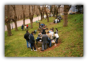 Tradicionalmente, la festividad de San Juan Bosco, a mediados de enero, se celebra en nuestro Instituto de forma especial. Nos damos día libre en las clases para irnos a la Bien Aparecida a comer todos juntos, profesores y alumnos. Allí hacemos un concurso de paellas y tortillas de patatas y damos chocolate con bizcochos a quienes quieran. Bueno, esto lo hacen los de Primero de Bachiller, que son los que lo organizan para acabar en una discoteca de Ampuero con una fiesta con la que recaudar fondos para su viaje de fin de curso. Pero antes de ir a la Aparecida, tiene lugar en el polideportivo municipal un partido de futbito entre profesores y alumnos. Al contrario de lo que pasó en años anteriores, este año han acabado el encuentro empatados, aunque Paco, el jefe de estudios del Primer Ciclo en el Colegio Primo de Rivera, acabó con un pie roto. Pero bueno, una alumna de Primero de Bachiller, Iratxe Pico Zornoza, ha preparado una crónica que explica bien todo lo ocurrido ese día. ![]() Equipo de profesores en partido profes contra alumnos De muchas maneras podría comenzar esta redacción. En primer lugar la fiesta ya cuenta en su haber con varios años de diversión y de marcha, y en segundo lugar ha sido muy especial, por lo menos para mí, porque este año he sido una de las organizadoras de la fiesta. ![]() Público en el partido profes contra alumnos La fiesta en sí cuenta con una pequeña liguilla de futbito