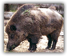 El jabalí, similar al cerdo doméstico, habita en los bosques de Cantabria. Su fuerza y su gran sentido del olfato y el oído le caracterizan. Siempre elige zonas con abundancia de agua porque, además de saciar su sed, necesita tomar baños de barro que eliminen los parásitos de su piel. El jabalí es un mamífero que puede medir de 60 a 80 centímetros, más una cola de 30 a 45 milímetros. Su peso es de 85 a 150 kilos. Suele vivir unos 30 años. Su piel es de un gris oscuro a un gris claro con cerdas largas, caninos retorcidos hacia arriba, sobresaliendo de la boca una longitud considerable sirviéndole de defensa en caso de que le ataquen.
