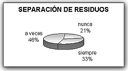 Resultados e interpretación de la encuesta Gráfico 1: Separación de residuos 1.- Porcentaje de gente que separa siempre los residuos. ![]() En la gráfica se puede observar que cerca de la mitad de las personas encuestadas tan sólo separan los residuos de vez en cuando, mientras que un 21% no lo hacen nunca.