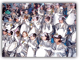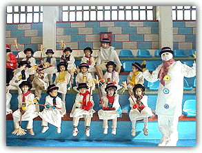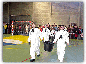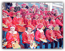 Se hizo un desfile de todos los participantes en el polideportivo y se cantaron las murgas correspondientes. y todos llevamos disfraz. El carnaval en el cole "mola" Un montón de días sin pegar bola. Pero antes de la fiesta Vamos a expresar nuestras quejas. No queremos más deberes Que nosotros ya tenemos nuestros quehaceres. El recreo es muy corto Y bajamos como motos. De las mates estamos hartos Y el ingles nos come el tarro. Ni en Reli somos buenos Y de música mejor no hablemos. Lo de Gimnasia es mas divertido Aunque José Antonio de nosotros está aburrido. Las vacaciones son muy breves Se pasan sin que te enteres Las notas llegan sin avisar ¡Que disgusto para los papás! Con la "dire" no nos metemos No vaya a ser que la enfademos En el comedor sugiero Que en vez de lentejas nos den cordero. Pero en el fondo nos gusta el cole Y no son tan malos los profesores Estos versos son sin malicia Nos ayudó a hacerlos Alicia Sólo son para desear A todos un feliz carnaval. Para finalizar tomamos un delicioso chocolate con bizcochos en el patio grande del Colegio. Fue una estupenda fiesta de carnaval.