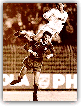 de un fuerte disparo de Butragueño que golpea en un jugador local,