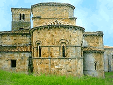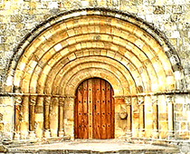 La portada abierta en su lado oeste es grande, sencilla y profunda, con ocho arquivoltas que apoyan sobre un cimacio decorado con palmetas que descansan sobre capiteles, muy deteriorados, tallados con felinos y serpientes entre otros motivos. Muy cerca de ésta, pero ya en la zona norte, bajo un soportal del siglo XVII, existe una puerta doble con arcos apuntados que da acceso a una ampliación de finales del XII o comienzos del XIII, con capiteles decorados con hojas vueltas, arpías y centauros muy similares a los que nos podemos encontrar más al sur, en los monasterios palentinos de San Andrés de Arroyo o Aguilar de Campoo. ![]() Puerta principal. La torre que se eleva en la zona sur se organiza en dos cuerpos del que destaca el superior ligeramente más estrecho con ventanas dobles divididas por columnas con capiteles historiados. Remata la torre una cornisa lisa sostenida por canecillos decorados. ![]() Lateral de la torre. En el interior destacan sus magníficas proporciones, inusuales