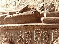 del siglo XIV. ![]() Cristo del siglo XIV. El ábside principal se adorna con una bella arquería de ocho arcos de medio punto con guardapolvos decorados. Apoyan sobre capiteles iconográficos con temas de singular interés como el enfrentamiento de infantes a pie, luchadores, pelícanos, etc... La entrada se hace al oeste por una gran puerta de numerosas arquivoltas lisas. La bóveda de la nave parece que fue modificada a partir del siglo XVI. Los capiteles de los arcos torales, iconográficos y con animales, sostienen la cúpula sobre trompas. La torre, una de las más solemnes del románico montañés, es prismática y con ventanales a distinta altura. Los del cuerpo superior son ajimezados y con capiteles animalísticos. Se sabe muy poco del desenvolvimiento histórico de este monasterio - luego colegiata - pues sus archivos se perdieron en distintos incendios en los siglos XVI a XVIII. Al exterior, los muros verdaderamente románicos de Santa Cruz de Castañeda se subrayan por las secuencias clásicas de sus canecillos decorados. ![]() Sepulcro. El monasterio de Santa Cruz debió de remontarse al menos al siglo X y tener dominio amplio por todo el valle de Pisueña, que ya en el siglo XII era realengo, pasando más tarde al señorío de don Tello, hijo de Alfonso XI, y, por sucesión, a la familia de los Manrique. Por último, podemos reseñar los sepulcros conservados, de soberbia decoración de lacería, siendo el más monumental el sepulcro yacente del siglo XIV del abad Munio González. Su pétrea estatua reposa sobre el sarcófago decorado con sus emblemas heráldicos y sostenido por leones.