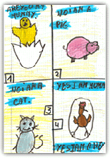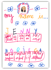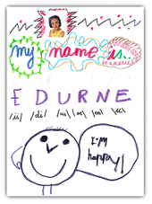 Dibujos elaborados en clase de inglés. En ellos se puede leer My name is ( mi nombre es) acompañado del nombre de la autora y su transcripción fonética. ![]()