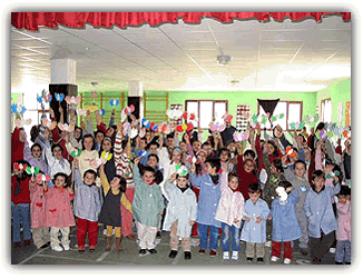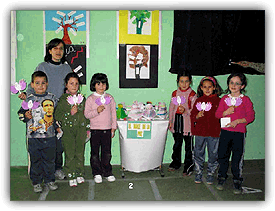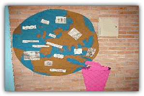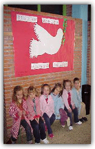 Los alumnos elaboraron poemas, dibujos, pensamientos, murales, reflexiones, pegatinas con los valores positivos por un lado y los negativos por otro y que luego se convirtieron en las hojas de unos preciosos árboles que ahora adornan el patio del colegio... todo ello con mucho colorido y una muy resaltable participación y entusiasmo por parte de los chicos y las chicas. ![]() Alumnos de 1º de Primaria. Como elemento común se confeccionaron unas vistosas palomas de colores varios y preestablecidos, que servirían para ser agitadas por sus autores al citarse su color en la lectura que los alumnos y las alumnas de 6º hicieron, por cierto muy bien, del cuento que lleva por título EL MUNDO DE COLORES. ![]() Mural del primer ciclo. El patio cubierto se transformó por arte de birle-birloque en excelente Sala de Exposiciones donde colgamos todos nuestros trabajos y donde procedimos a realizar una visita por grupos. Luego, los alumnos de 4º recitaron y leyeron las conclusiones a las que habían llegado en su trabajo sobre los campos de refugiados y nos presentaron su mural correspondiente.