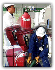 sino agua pura y cristalina. El hidrógeno es el elemento más simple que se encuentra en la naturaleza (está formado por un protón y un electrón) y se obtiene de distintas fuentes: del agua, de los desechos sólidos, de los residuos de la producción de papel y de muchas otras aguas residuales que contienes compuestos hidrogenados. Las nuevas tecnologías permiten ahora este fabuloso gas de las moléculas de agua (electrolisis) a un reducido coste. ![]() Trabajos en una planta de producción de hidrógeno. Sus aplicaciones son innumerables y ya se ha utilizado con éxito