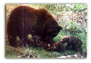 Pese a su aspecto, es un animal muy tímido que solo ataca en legítima defensa. Durante el invierno se alimenta de vegetales y en verano prefiere pequeños roedores, insectos y peces. En invierno se retiran a dormir a su osera, una caverna en un sitio casa inaccesible, que es donde hacen la vida los osos. En este proceso de pasar dormitando todo el invierno se llama hibernación, prefiere la noche para dar sus paseos. Hábitat: Hace mucho tiempo el oso estaba extendido por la Península Ibérica ahora quedan unos 90 ejemplares y éstos se encuentran en zonas abruptas donde le es fácil esconderse, como las montañas del Norte. Lugares donde habita el Oso Pardo: Los Pirineos navarros y leridianos , los Picos de Europa y la comarca de los Ancares, en el límite de León y Lugo. Conservación: La fundación del oso pardo tiene en marcha unos proyectos que van más allá de calificar a esta especie como protegida, entre otros, el proyecto Huella, consiste en dar a conocer los osos de la población escolar; y el proyecto caza, que intenta obtener los beneficios de una razonable y equilibrada, a la vez que pretende eliminar la caza furtiva. Descripción: Cuerpo grande y compacto. Cabeza ancha, ocico largo, orejas pequeñas, patas robustas y cola muy corta. Puede pesar 265 kg. 9-11-98