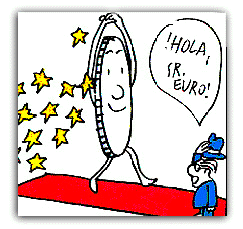 Pero en esta nueva moneda única no estarán todos los países que actualmente componen la UE, pues algunos no consiguieron los requisitos para entrar y otros han preferido continuar con su moneda nacional, como es el caso de Reino Unido. Alemania, Austria, Francia, Luxemburgo, Holanda, Irlanda, Finlandia, Bélgica, Italia, España y Portugal son los once países que a partir del año 2002 cambiarán definitivamente sus actuales monedas y billetes nacionales por un valor común: el Euro. Quedan, por tanto, menos de cuatro años para que se produzca un cambio radical en nuestra vida diaria. Nuestras compras, nuestros ingresos, los impuestos, los contratos de seguros, el resumen de cuentas bancarias, y todo cálculo monetario dejarán de hacerse y expresarse en pesetas; se harán y expresarán en euros. Visto desde ahora, parece difícil hacerse a la idea de lo ![]() Queda claro entonces que a partir del 2002, las generaciones venideras estudiarán la peseta como una moneda más dentro de las que se utilizaron a lo largo de nuestra Historia. La peseta ha muerto... ¡Larga vida al Euro!
