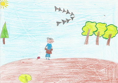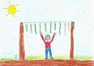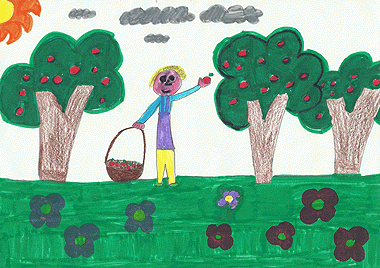 Un día por la mañana el señor Federico se levantó y su mujer estaba con su gato negro y su perro, que estaba un poco asustado. La mujer estaba limpiando los cristales y el gato acostado en la cama. Después fue a recoger la colada porque estaba lloviendo. Cuando salió el sol fue a coger manzanas y a regar las plantas, mientras el señor Federico estaba mirando por la ventana. Por la tarde la señora Carmen salió a talar árboles para en el invierno estar calientes. Después fue a recoger nabos para hacer ensalada con ellos y también estaba triste.