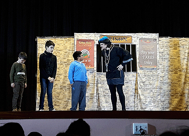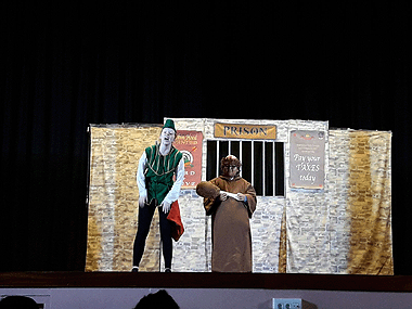 Algunos de nuestros estudiantes de Primaria, como Mateo, de 3º; Johann, de 2º e Isabel, de 4º, se convirtieron en actores por un día. Subieron al escenario y ayudaron a Robin, junto a su banda 'The Merry Men', a devolver al pueblo la alegría y la justicia tras la recaudación de impuestos del Sheriff de Nottingham, un hombre malhumorado y avaricioso, a los pobres ciudadanos.